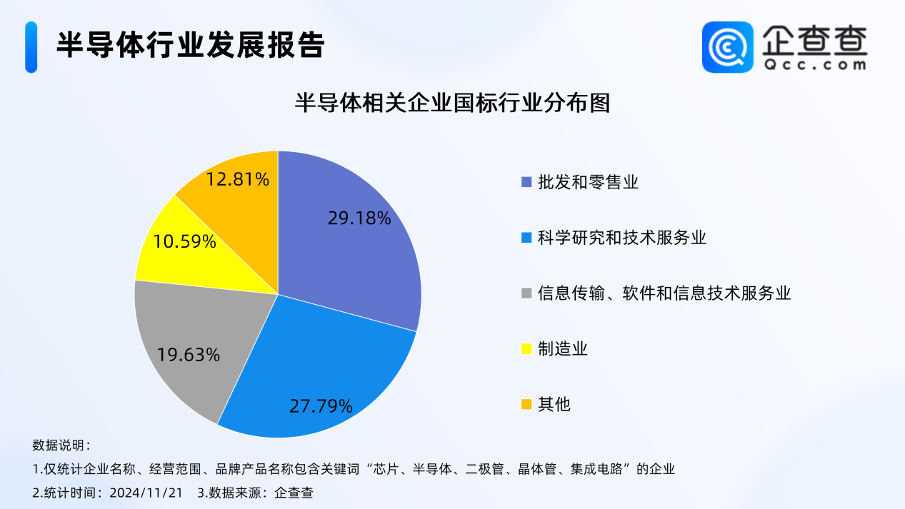 数据显示,现存半导体相关企业主要分布在批发和零售业、科学研究和技术服务业,信息传输、软件和信息技术服务业,分别占比29.18%、27.79%,19.63%,值得注意的是,半导体多属技术密集型企业,科学研究和技术服务业,信息传输、软件和信息技术服务业在内的两项技术类国标行业合计占比高达47.42%。