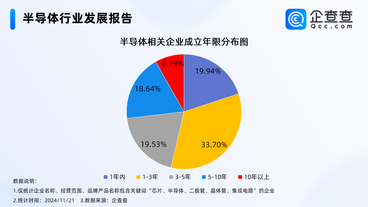 数据显示,从成立年限分布来看,现存半导体相关企业中,近三年成立的企业占比过半,其中成立年限在1-3年的企业占比最大,为33.70%,成立年限在1年内的企业占比19.94%。此外,成立年限在10年以上的企业近一成,为8.19%。