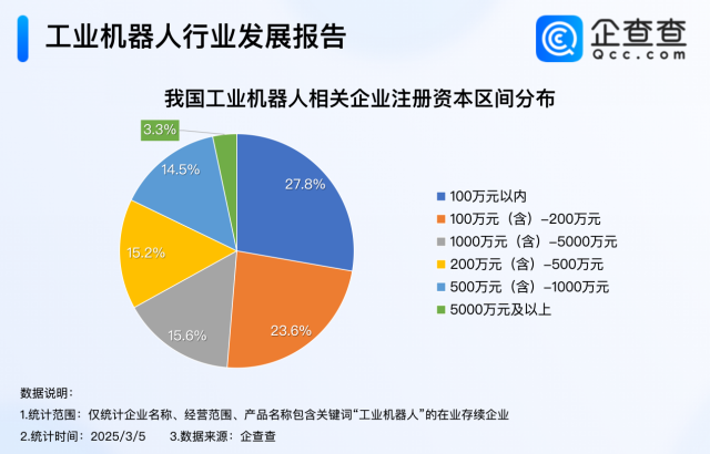 公示注册资本的现存工业机器人相关企业中,注册资本在100万元以内的企业最多,占比27.8%,其次是注册资本在100万元-200万元的企业,占比23.6%,注册资本在1000万元-5000万元的企业占比15.6%。综合来看,我国工业机器人相关企业注册资本以200万元以内为主,合计占比51.3%。
