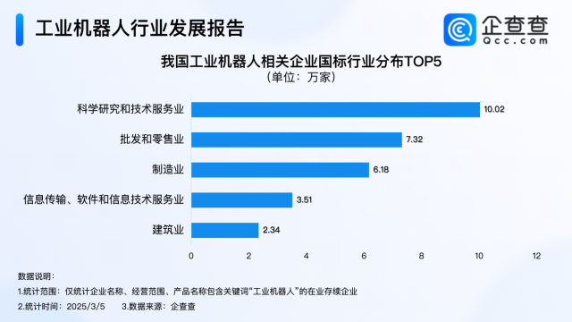 我国现存32.3万家工业机器人相关企业,行业分布上,归属科学研究和技术服务业的企业最多,有10.02万家,占比31.1%;其次是归属批发和零售业的企业,有7.32万家,占比22.7%;归属制造业的企业有6.18万家,占比19.1%。