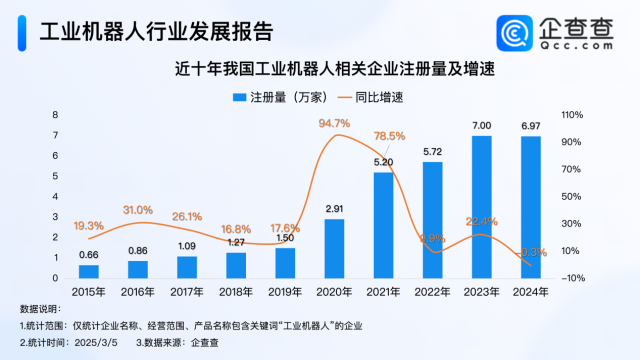 近十年,我国工业机器人相关企业注册量基本呈现逐年增加的趋势,尤其是2020年,全年注册量同比大幅增加94.7%至2.91万家,成为近十年注册量增速最大的一年;次年注册量首次突破5万家,全年注册量同比增加78.5%至5.20万家;2023年,我国累计注册7.00万家工业机器人相关企业,创近十年注册量新高;2024年注册量与2023年同期基本持平。截至目前,今年已注册1.2万家。