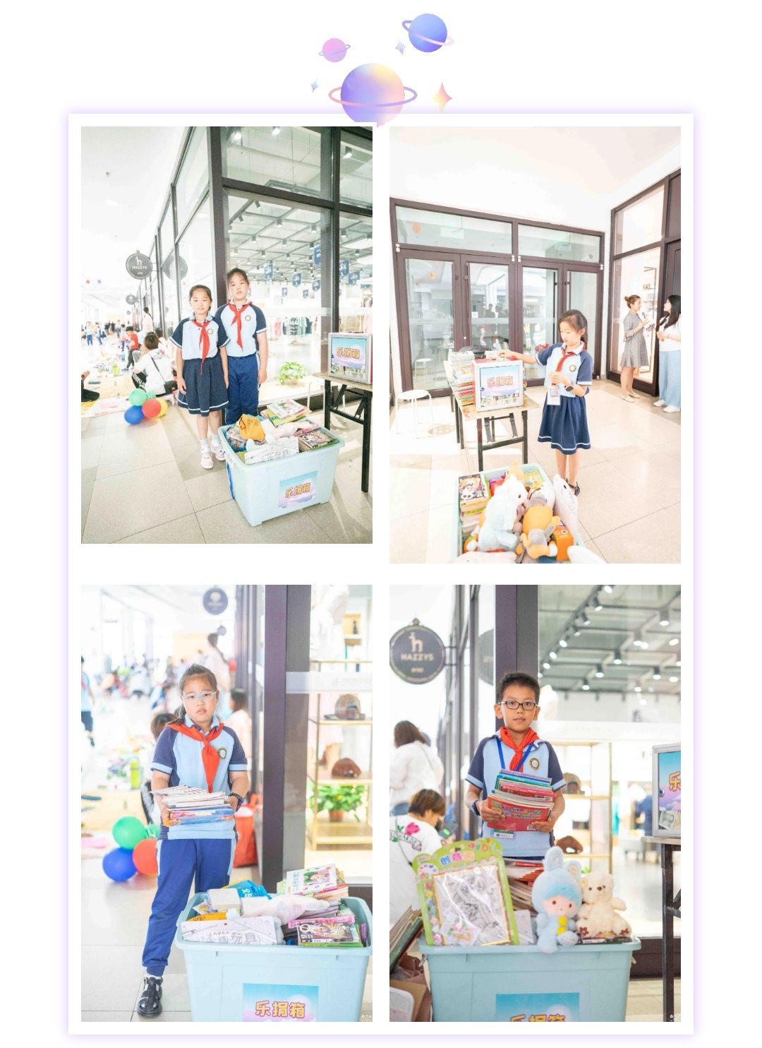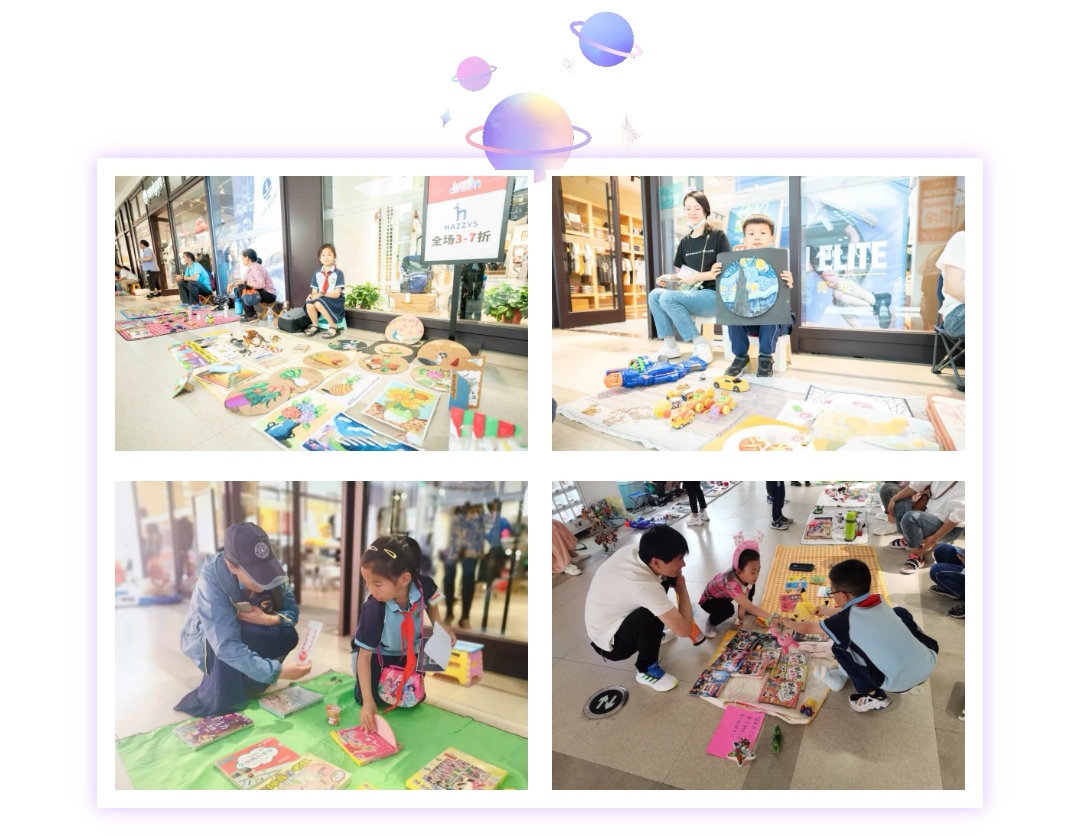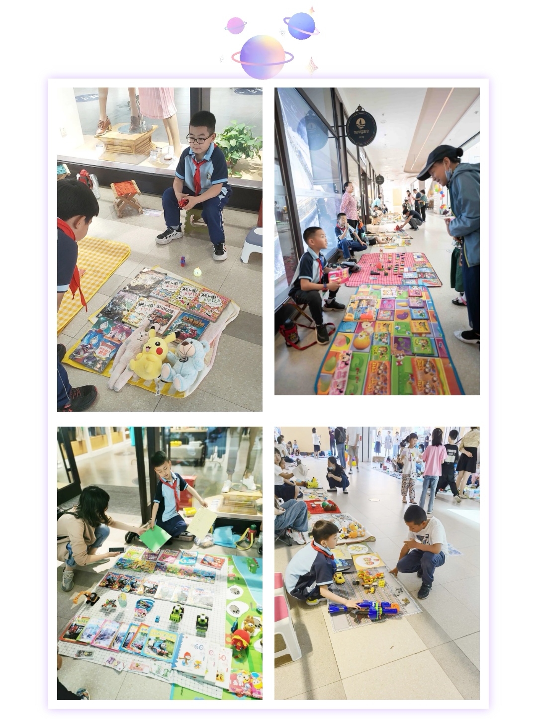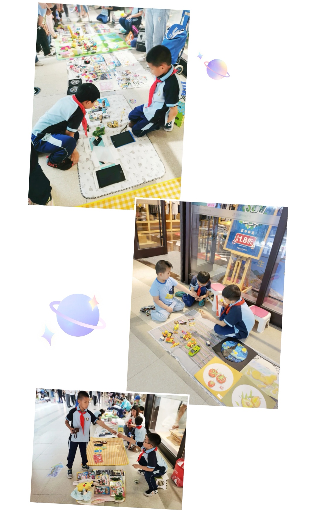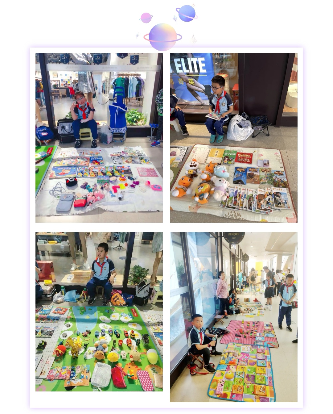 看!偌大的百联广场一下沸腾起来,热闹非凡!醒目独特的招牌拔地而起,响亮可爱的叫卖声不绝于耳,“全场五元,满十五元减两元啦!”“全场小汽车买一送一啦!”同学们摇身一变,成了经验丰富的小掌柜,热情销售着自己的商品,文具、图书、玩具、艺术作品……琳琅满目的商品吸引了众多游客驻足购买。