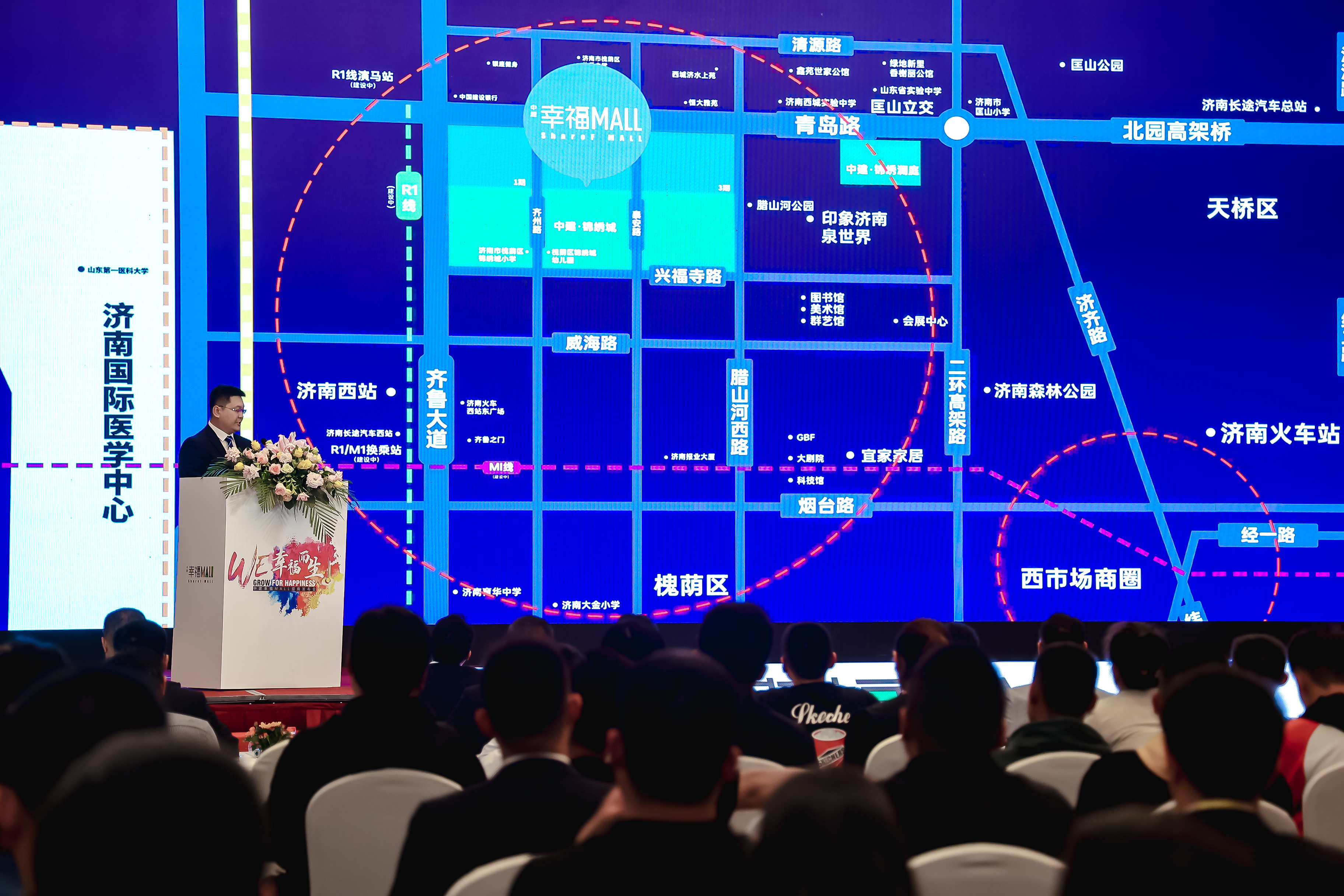 项目负责人上台进行项目推介,从购物中心的地理区位、资源禀赋、设计理念、消费体验、多元业态等维度,诠释了济南中建·幸福MALL独一无二的经营优势与未来发展的无限可能。