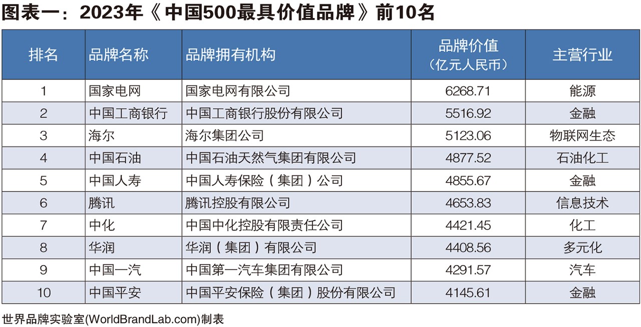 国家电网、中国工商银行、海尔、中国石油、中国人寿、腾讯、中化、华润、中国一汽以及中国平安位列2023年《中国500最具价值品牌》前10强。