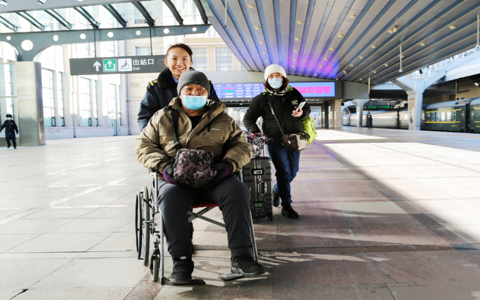北京站京铁爱心服务组工作人员杜京林帮助重点旅客进站(中国铁路北京局北京站供图)