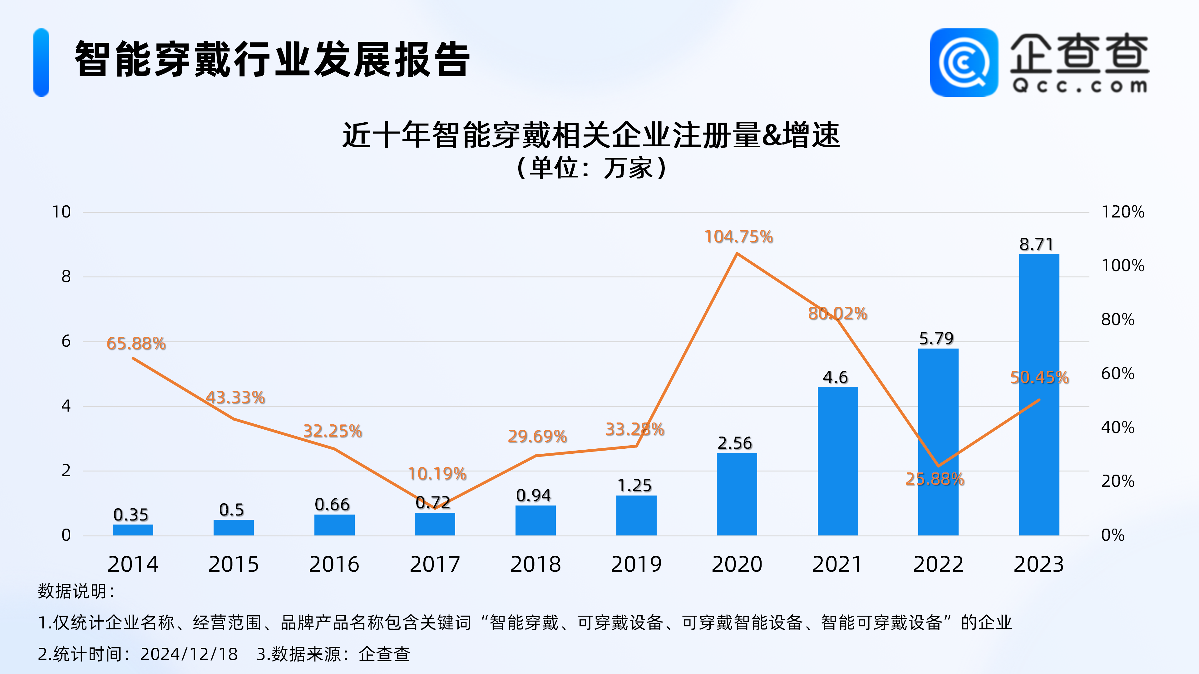 数据显示,国内现存智能穿戴相关企业30.63万家。近十年相关企业注册量持续增长,其中,2020年注册量猛增104.75%至2.56万家,达近十年增速峰值。2023年全年注册8.71万家,同比增长50.45%。