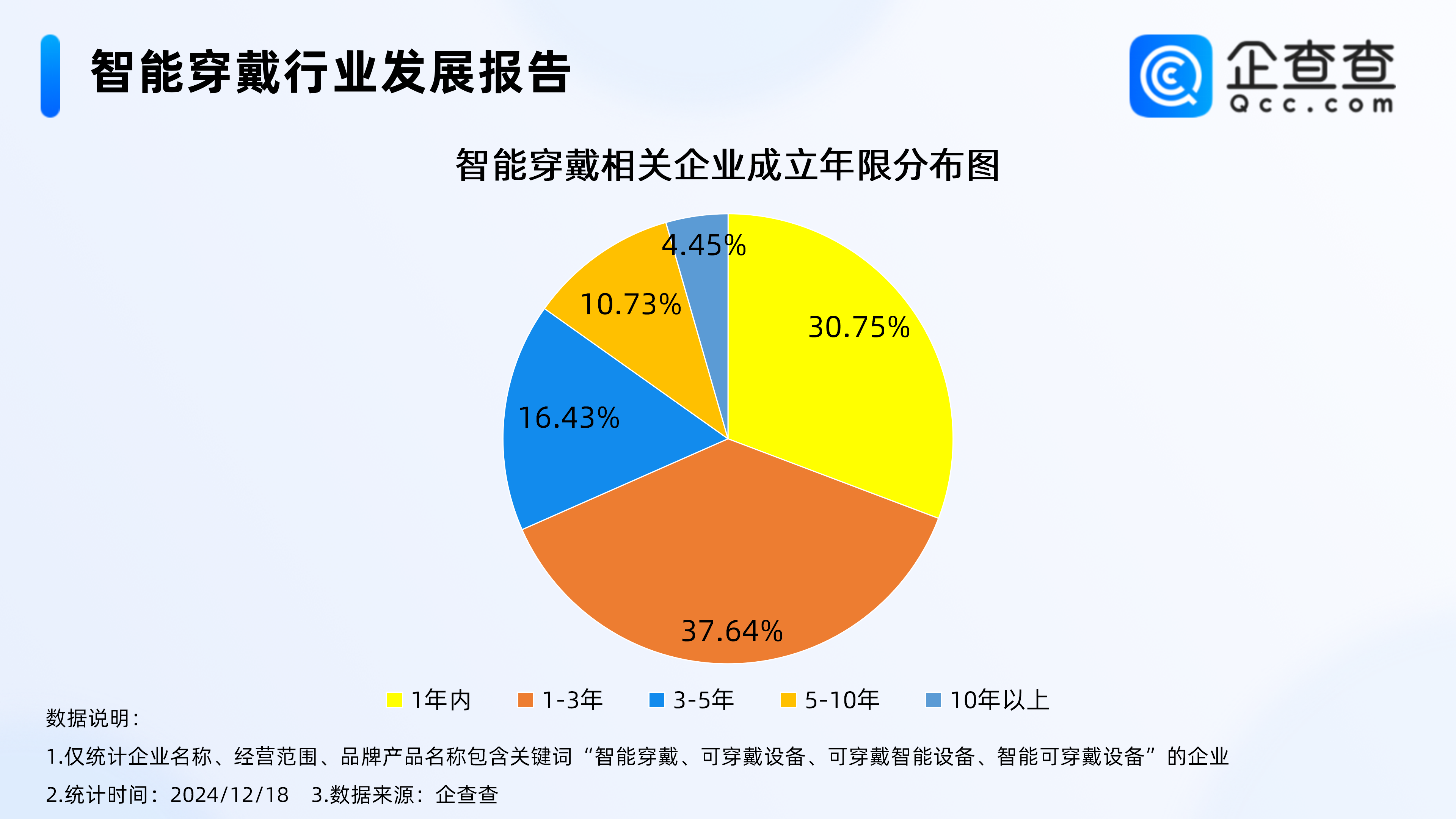 数据显示,从成立年限分布来看,现存智能穿戴相关企业中,近七成企业成立于近三年,其中成立年限在1-3年的企业最多,占比37.64%。其次,成立1年内的企业占比30.75%。此外,成立10年以上的企业占比4.45%。